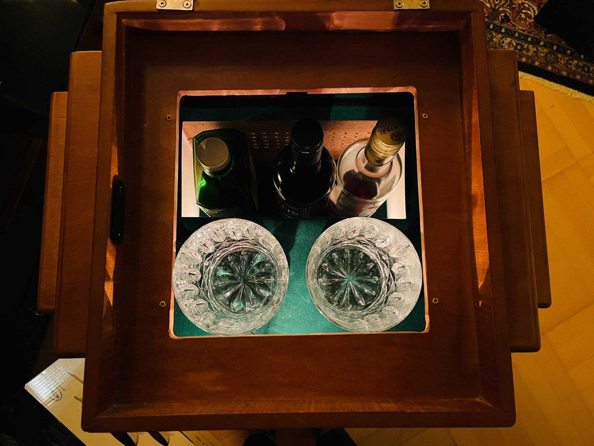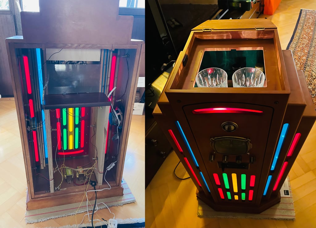 I bought an old radio, extracted and removed some of the insides (incl. CD player), added some shelves for the glasses and bottles to sit on and walls to support the shelves and makes sure everything stays in place. Then, I added some green felt lining to add a cleaner look. As a final touch I installed LED lights to complete the retro vibe. Voilà.